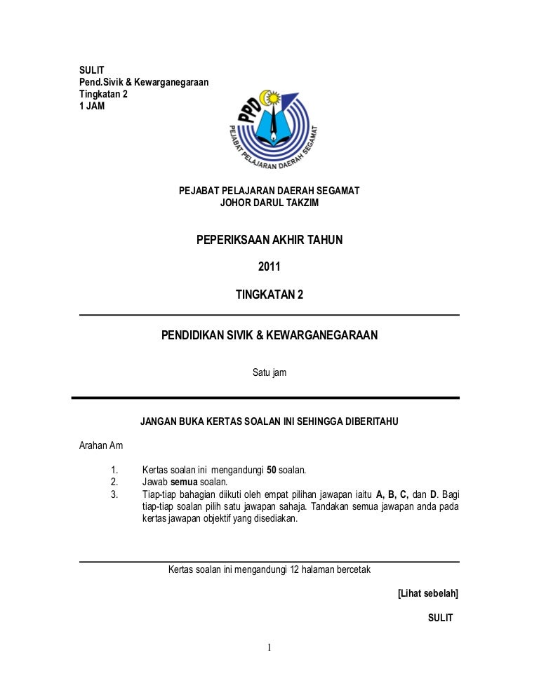 Pendidikan Sivik Kewarganegaraan - Tingkatan 2. ContentsNAMA BAHANSUMBERMUAT TURUN CETAK Ujian Pertengahan Tahun Tingkatan 3 sudah bakal tiba. _____ Kertas ini mengandungi 60 soalan.