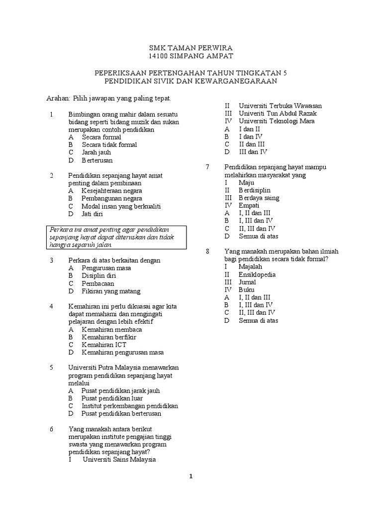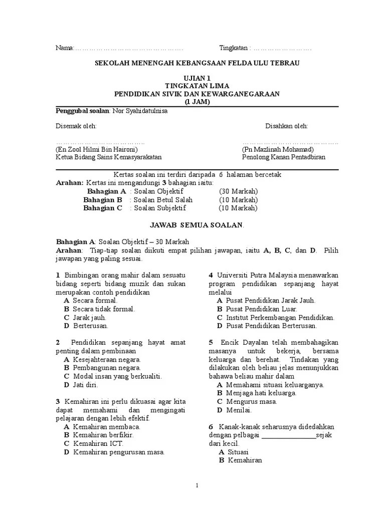 Ujian Pertengahan Tahun Pendidikan Sivik kewarganegaraan Tingkatan 5 Kurikulum Standard Sekolah Menengah KSSM merupakan kurikulum baharu yang diperkenalkan pada waktu ketika KSSR diperkenalkan di sekolah rendah. Bahan Soalan Tingkatan 1. Koleksi Soalan Latihan Nota Modul Tingkatan 3 Tiga Jawapan.